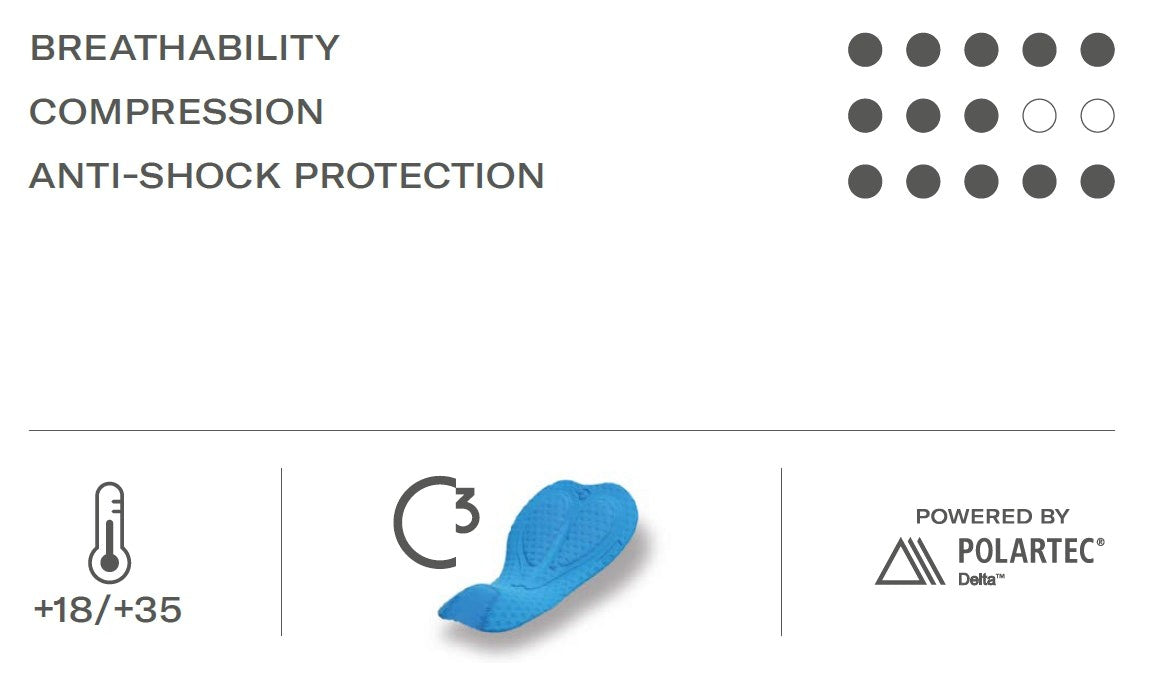 Bibshorts specifically studied to generate increased transpiration for indoor training. Made with advanced materials that actively promote cooling and enhance breathability. Featuring perforated quads panel and our innnovative C3 chamois with multi layer foam and gel inserts.