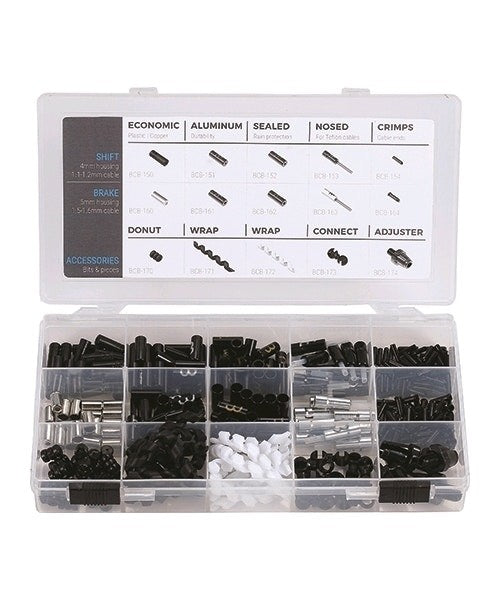 Sparepart kit for mechanical brake and shift systems. Includes ferrules for different applications. Good for up to 10 replacements. 290 pcs. total: