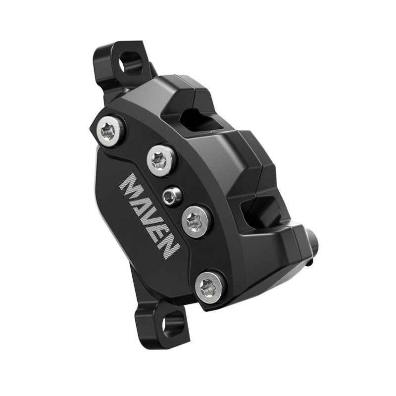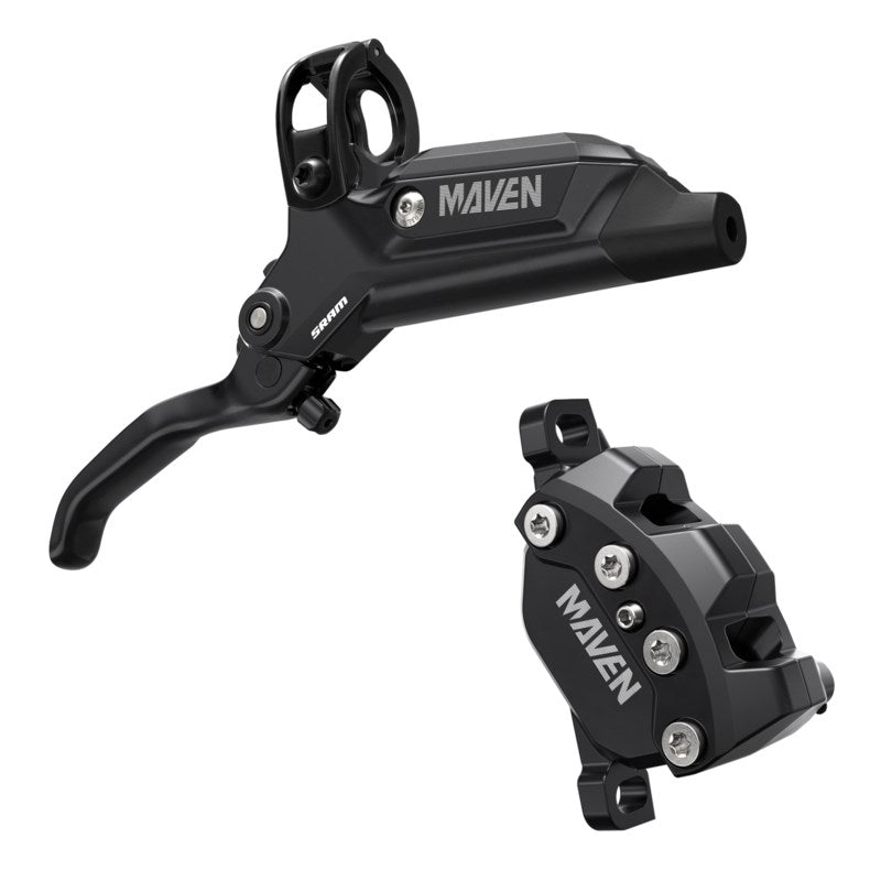 SRAM Disc Brake Maven Base - Aluminum Lever, Stainless Hardware, Reach Adj, Diffusion Black, Front, 950mm Hose (includes MMX Clamp,20P-2 Bracket) A1Modern mountain bikes have redefined what riders are capable of, pushing the requirements for extreme-duty power further than ever before. Maven is our answer to that evolution, giving you the boundless power of confidence for elevated speed and control on ever-more demanding terrain. Maven Base’s lever body houses Directlink, which translates rider input for a smooth application of power. And because of a stiff 4-bolt caliper that sheds an incredible amount of heat, that feel remains consistent, so the last corner feels like the first corner. And with so much baseline power on hand, there is more range than ever before to tune the ride qualities to exactly how you want with different pad materials, and rotor sizes. Maven Base features a Blast Black anodized finish, and for ease of customization includes tool-free Reach Adjust.