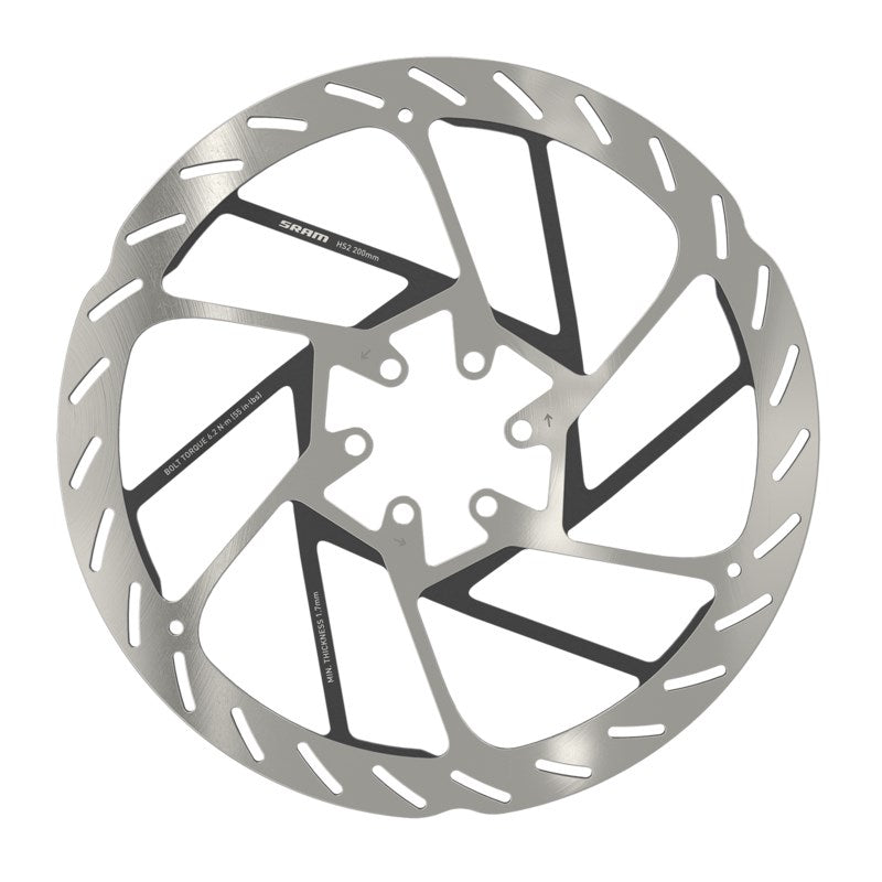 SRAM Rotor HS2 160mm 6-bolt (includes Steel rotor bolts) RoundedThe all new HS2 Rotor is a mountain bike specific rotor designed to improve brake performance while reducing noise and increasing heat dissipation. Featuring a new brake track pattern for increased pad traction and recessed spokes with thermal dissipating paint, the HS2 is a more powerful, quieter rotor with best-in-class heat management.Thicker 2.00mm rotor