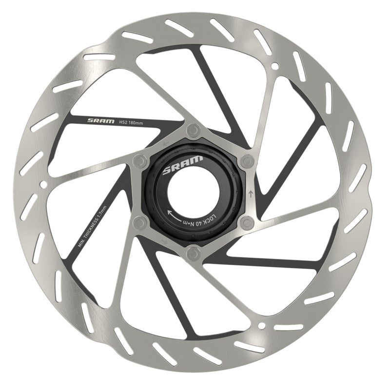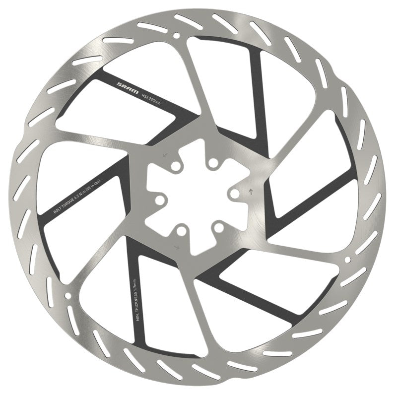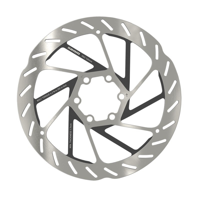 SRAM Rotor HS2 220mm Center Lock Rounded (includes external tooled lockring)The all new HS2 Rotor is a mountain bike specific rotor designed to improve brake performance while reducing noise and increasing heat dissipation. Featuring a new brake track pattern for increased pad traction and recessed spokes with thermal dissipating paint, the HS2 is a more powerful, quieter rotor with best-in-class heat management.Thicker 2.00mm rotor