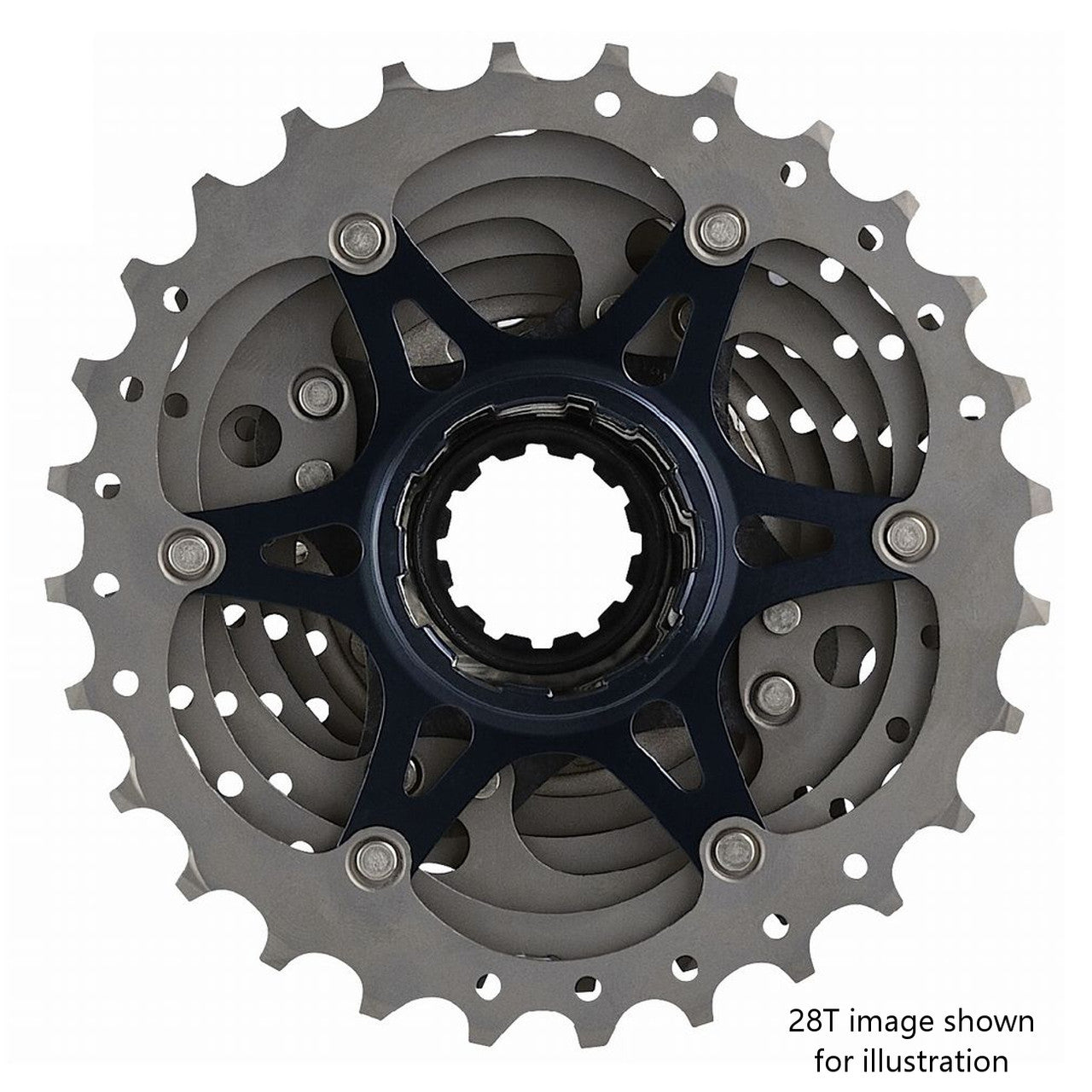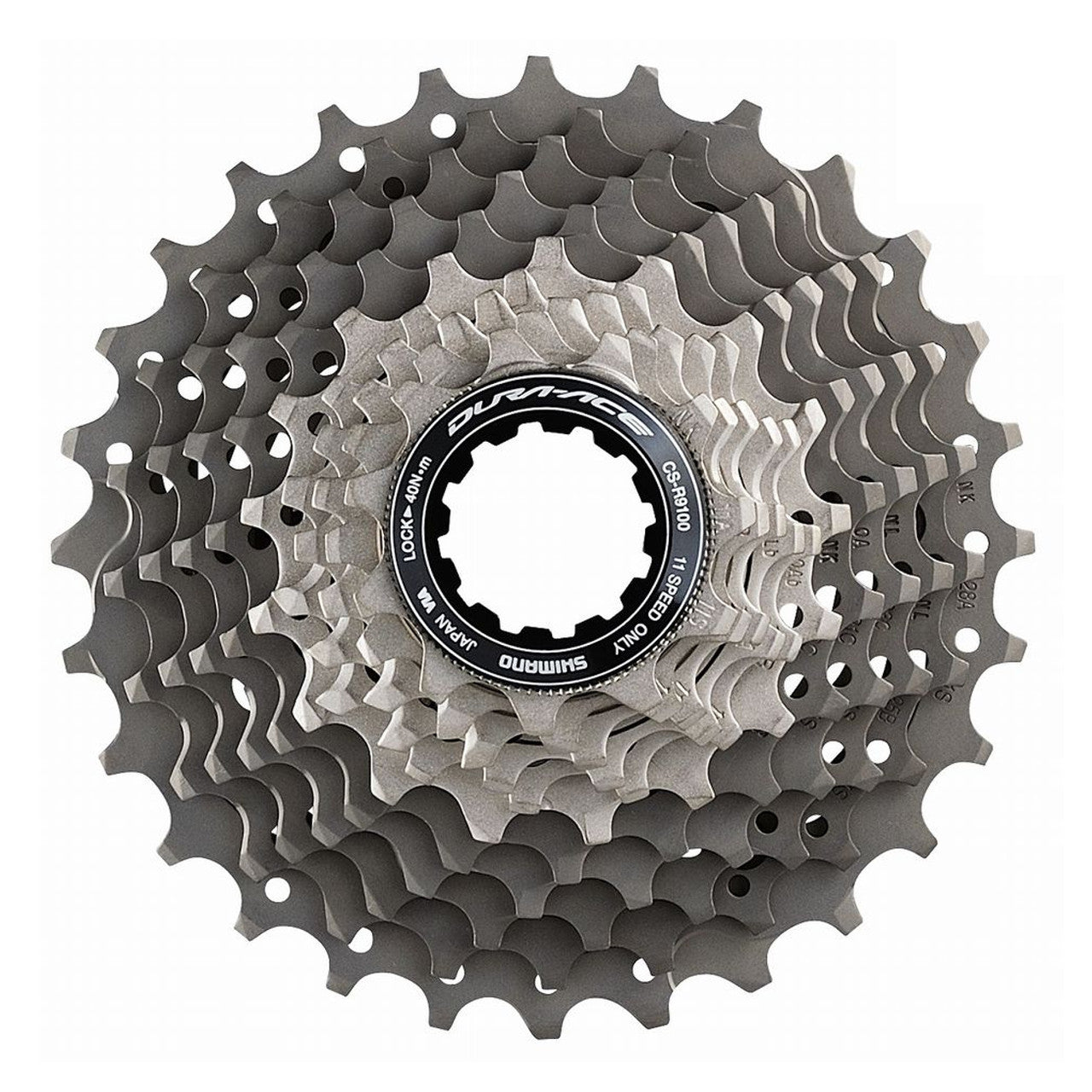 Match your riding style as well as your chosen terrain with Shimano's lightweight Titanium Dura Ace CS-R9100 11-Speed Cassette. New combinations of gearing options have been added including expanded choices for gearing appropriate to wheels, climbers, and the punchers who demand the best of both worlds, but the cassette's feathery construction combination of titanium and nickel-plated steel cogs (along with alloy and carbon carrier) remain tried, true and unaltered. The CS-R9100 Shimano 11-25T cassette with hyper-glide is most definitely a welcome addition to the cassette line up and provides the Dura Ace R9100 series, on the back end of the drivetrain, with a wider range of graduation, along with fast, accurate and smooth shifting in all situations. No matter if, you are up shifting or down shifting, the Dura Ace R9100 cassette stands out above all others through its' reliable and easy shifts.. Smooth running and reliable 25T, 11SP Cassette