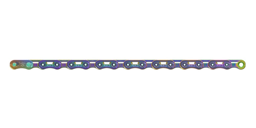 SRAM Chain Red E1 Flattop 114links Rainbow w/ PowerLockWe took the lightest and most durable chain we’ve ever made and made it lighter. With no compromises. Our HollowPin construction is lighter and stronger than a solid pin, and cutouts in the outer and inner plates drop 13 g from the previous generation. Can a chain really be lighter, faster, stronger and more durable than anything else? This one is.Flattop technology enables a narrower chain with quieter operation and increased strength and durability