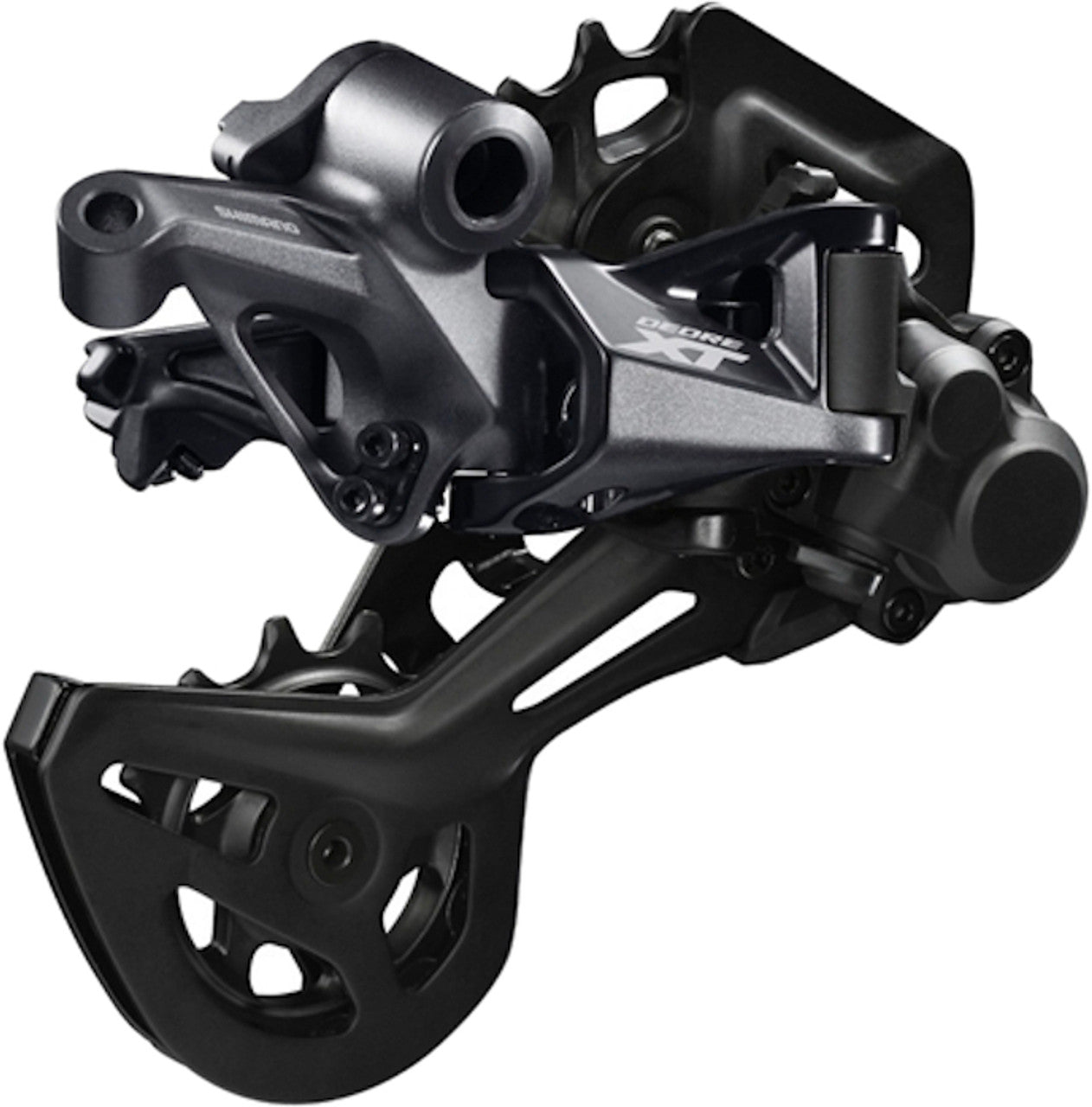 Maximum 12spd RangeThe all-new SHIMANO DEORE XT M8100 series of derailleurs brings a new level of drivetrain silence thank to decreased tension in the low gear position and an added bumper on the pulley cage. Larger 13T pulleys increase efficiency and chain management while compatibility with SHIMANO's new 12-speed cassettes boosts range.