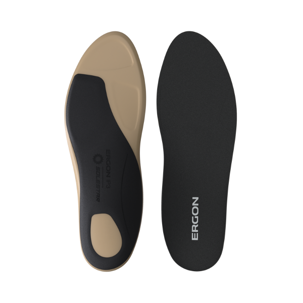 Misalignment of the feet can significantly limit the enjoyment of cycling. With the IP Touring Solestar, Ergon offers all touring riders a significant gain in comfort, especially when covering longer distances. The patented stabilization delta keeps the foot in an ergonomic position, prevents discomfort and optimally transfers leg power to the pedal. Efficiency is maximized with a grippy surface made of nylon fabric. Finely ground walnut shells in the 3D foam padding aid in a keeping the feet cool. The insole shell, made of fiberglass composite, enhances pedaling efficiency. The IP Touring Solestar was developed with the internationally renowned insole specialist Solestar.