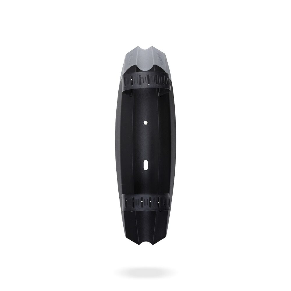 - Downtube mounted fender. Composite material with softer TPR flap. Suited for extreme mountain biking. Dual elastomer strap attachment