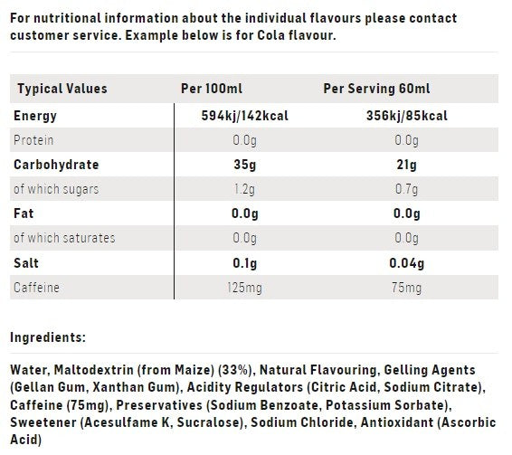 Water, Maltodextrin (from Maize) (33%), Natural Flavouring, Gelling Agents (Gellan Gum, Xanthan Gum), Acidity Regulators (Citric Acid, Sodium Citrate), Caffeine (150mg), Preservatives (Sodium Benzoate, Potassium Sorbate), Sweeteners (Acesulfame K, Sucralose), Sodium Chloride, Antioxidant (Ascorbic Acid)
