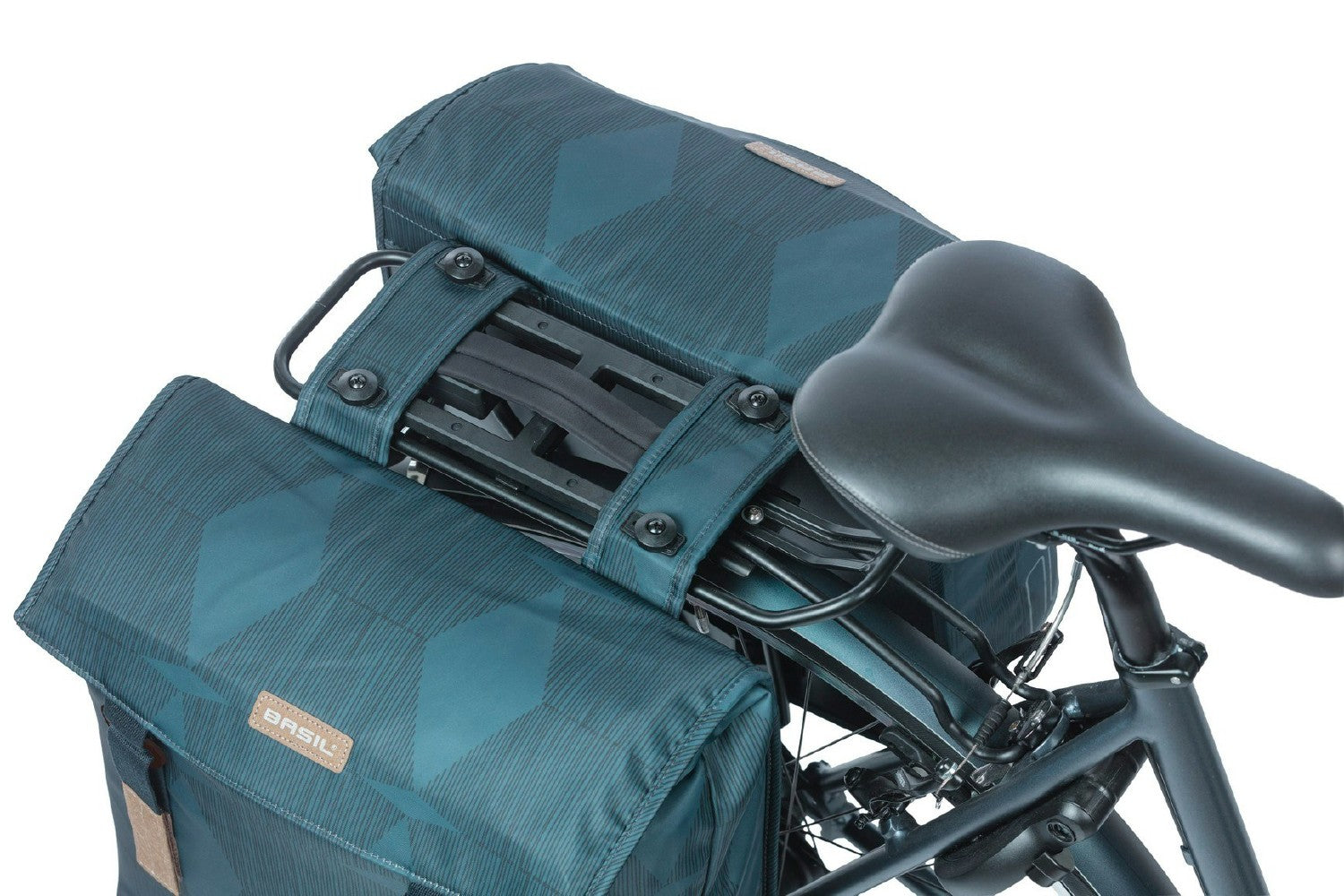 Meet the Basil Elegance – a stylish blue double bicycle bag with a pre-assembled MIK adapter plate for easy attachment to women’s bicycles.