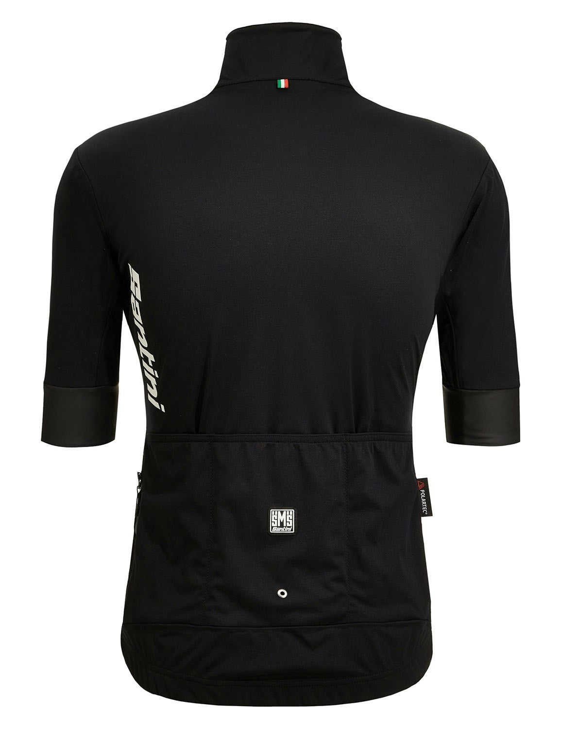 Reflective shoulder band, back insert and reflective Santini logo on the back tail to ensure maximum safety in the darkest hours.High performance, short-sleeve foul weather jacket made of POLARTECs Neoshell highly stretchable knitted fabric. Providing superb wet weather protection, while offering class leading aerodynamics, breathability and comfort.