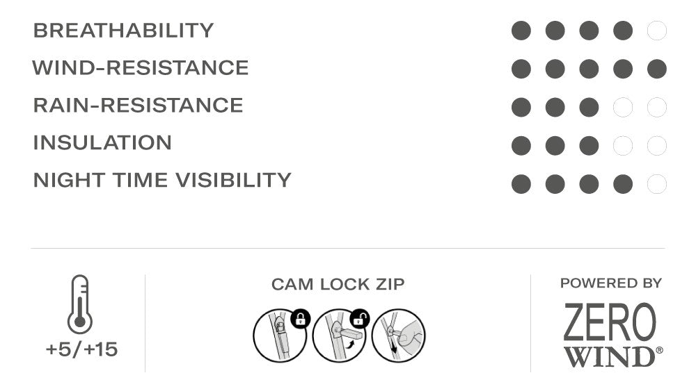 Made with the 2 layer Tovel Bio Zerowind membrane fabric. Ideal for wind and light rain protection.