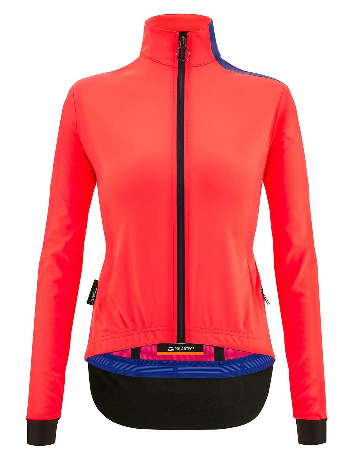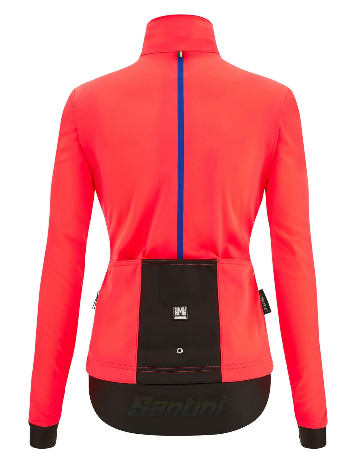 Reflective shoulder band, back inserts, and reflective Santini logo ensure maximum safety in low visibility.All-weather winter jacket cut for women. Vega Multi is designed to guarantee complete thermal balance in any climate conditions. Ideal for cold rides and very wet weather. Innovative water resistant hood that can be folded in to the collar.