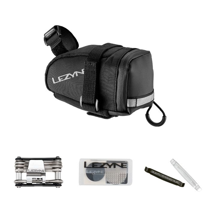 The M-Caddy is a medium, wedge-shaped saddle bag. It's built from durable woven nylon construction and features a large main compartment with labeled organizational pockets as well as a sub-compartment for a multi-tool or mobile device. Velcro straps attach to saddle rails and seatpost. Reflective logos and loop increases night visibility. Water-resistant zipper with large pull loop. Also available in Tubeless, CO2, Sport, and loaded kits.