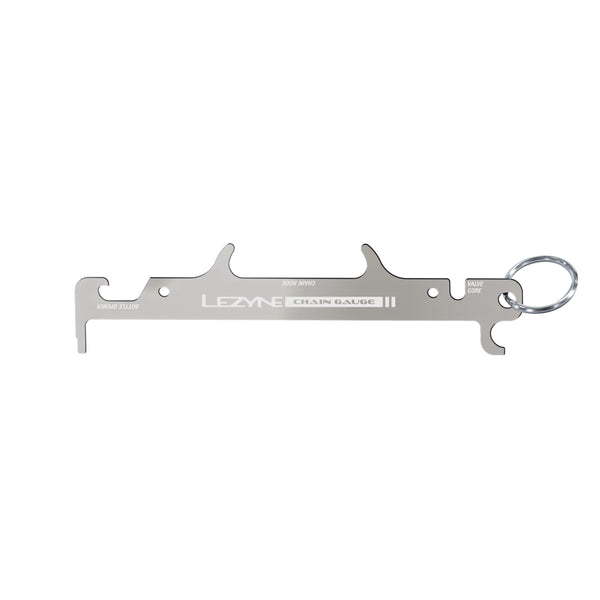 Sensible and stylish, the Chain Gauge is a multi-function bike chain checker featuring an integrated chain hook and wear indicator as well as a handy valve core removal tool. Compatible with most 8/9/10/11/12-speed bike chains and precision-machined for superior accuracy, the Chain Gauge is a stainless-steel insurance policy against premature drivetrain wear. Hang it close to your repair stand with the included ring so you’ll never go too long without checking your chain for wear again—just don’t forget to put it back after cracking a cold one with the integrated bottle-opener!