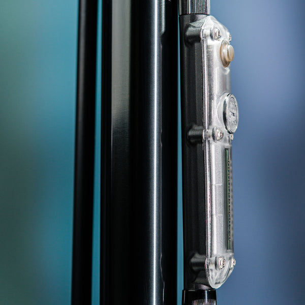 The Digital Travel Floor Drive has been built to be as efficient as possible while maintaining ultimate portability. It utilizes our traditional floor pump tech—an aluminum barrel, steel piston, and fully rebuildable internals—in addition to its innovative foldable stainless-steel feet, a low-profile ergonomic Composite Matrix handle, and an ultra-compact digital pressure gauge integrated into the hose. The hose is incredibly long at 99cm, making it functional with all bikes, even when they are mounted in repair stands. Weighing only 792 grams (1.75lbs), measuring 51cm long, and packing up to a scant 10cm wide makes it the most efficient floor pump for its size and portability. Capably provides up to 160 PSI (11 BAR).