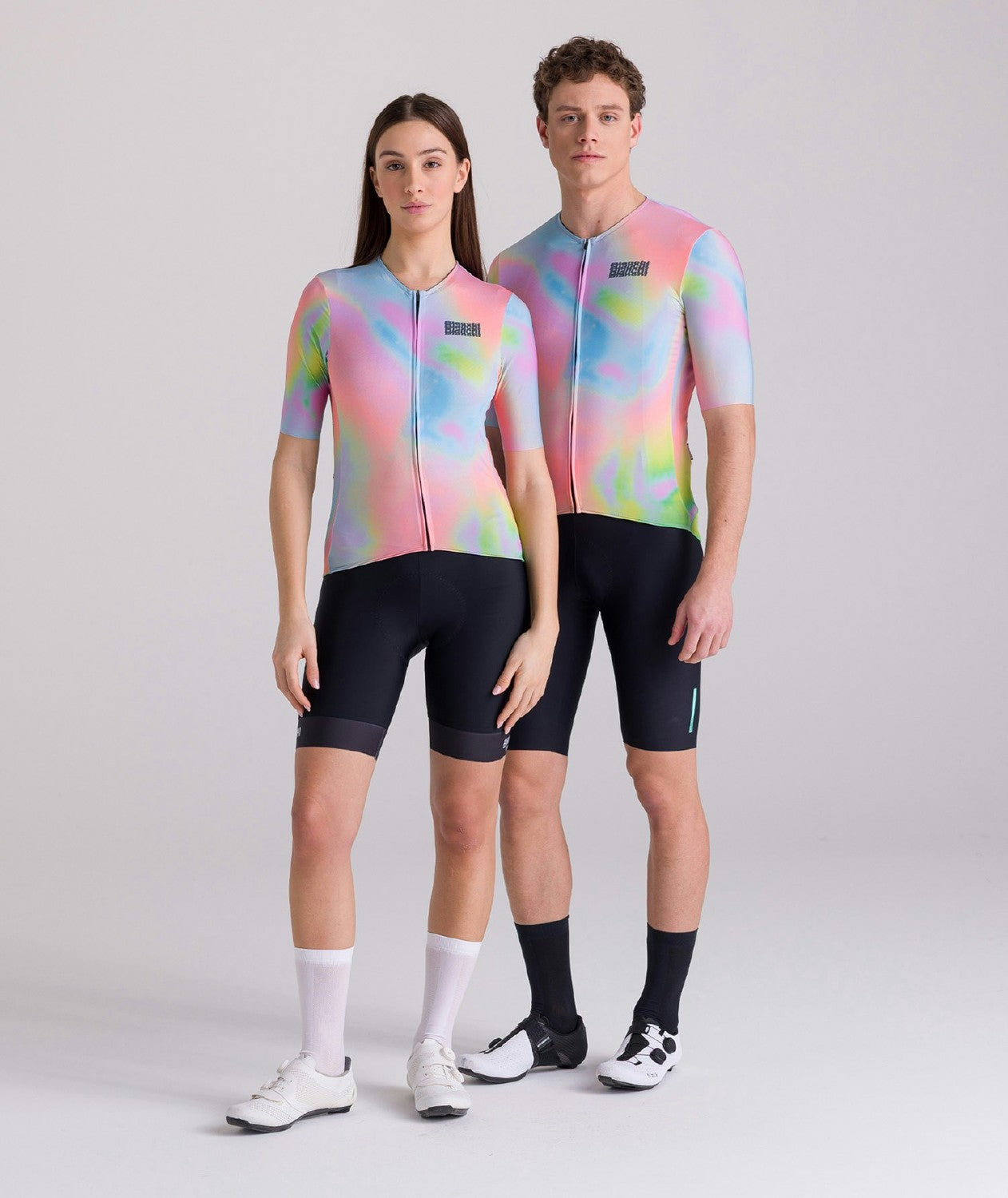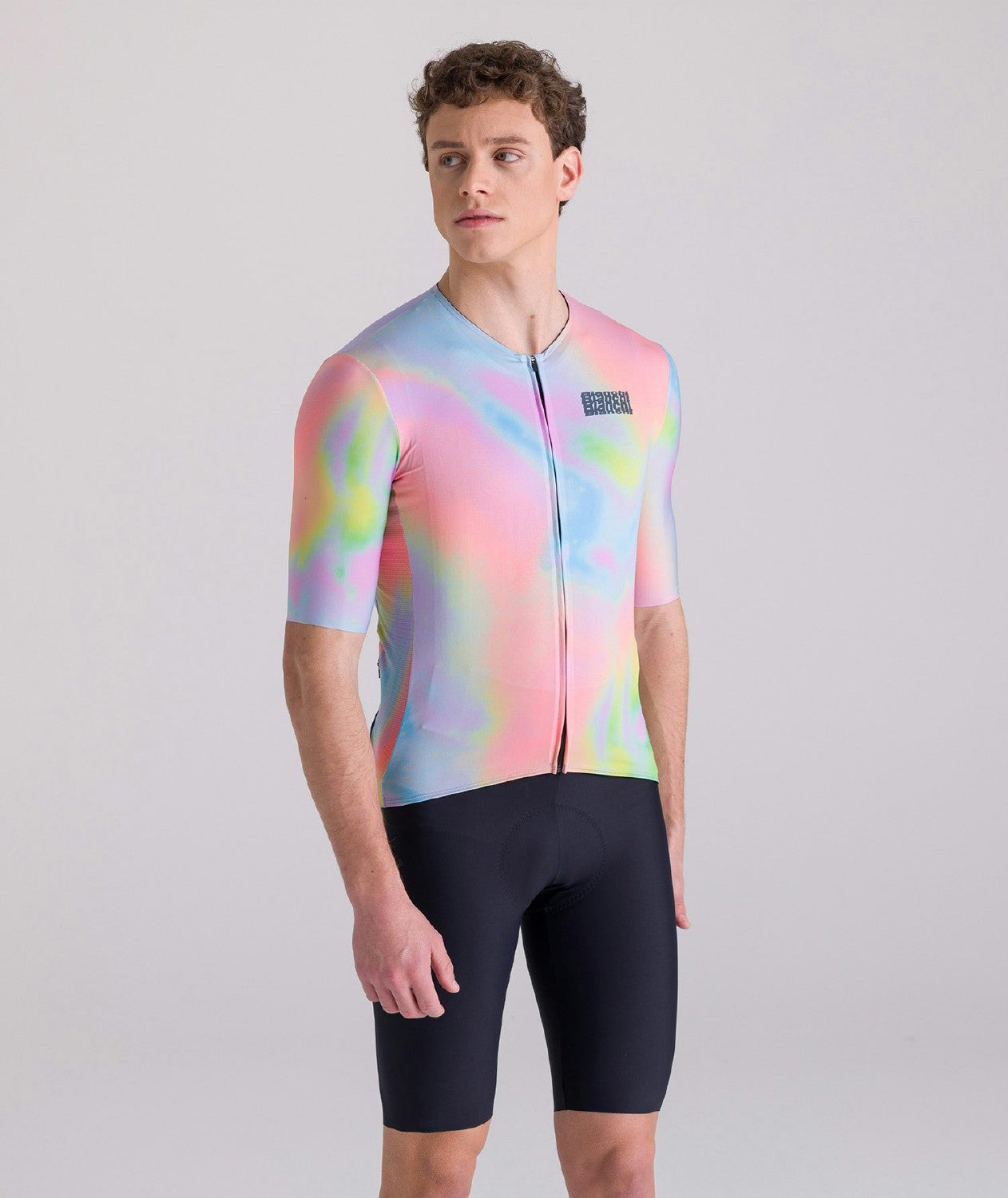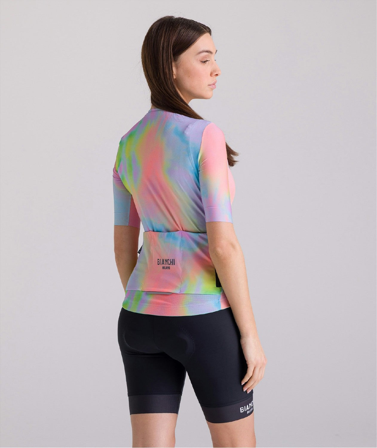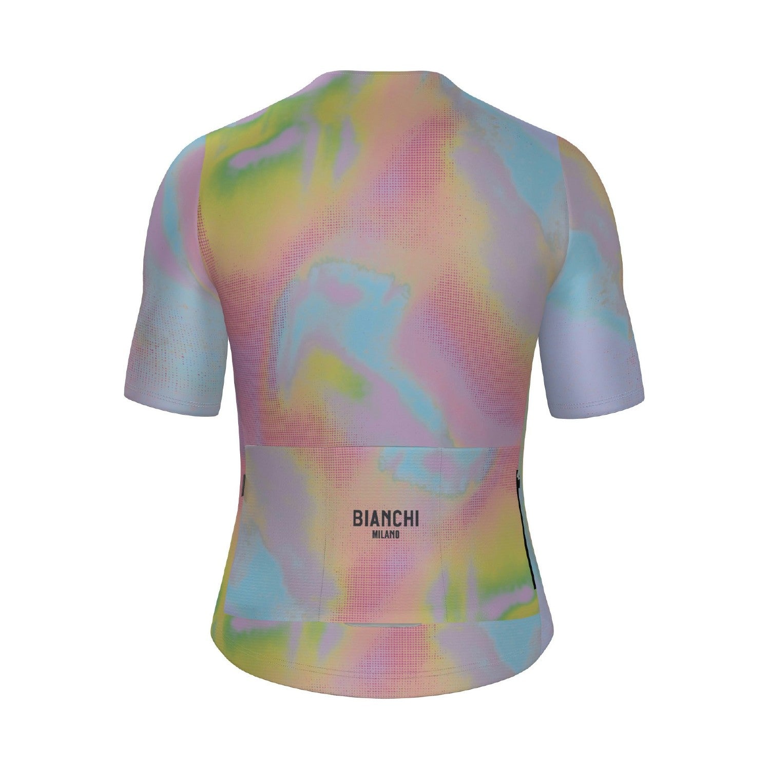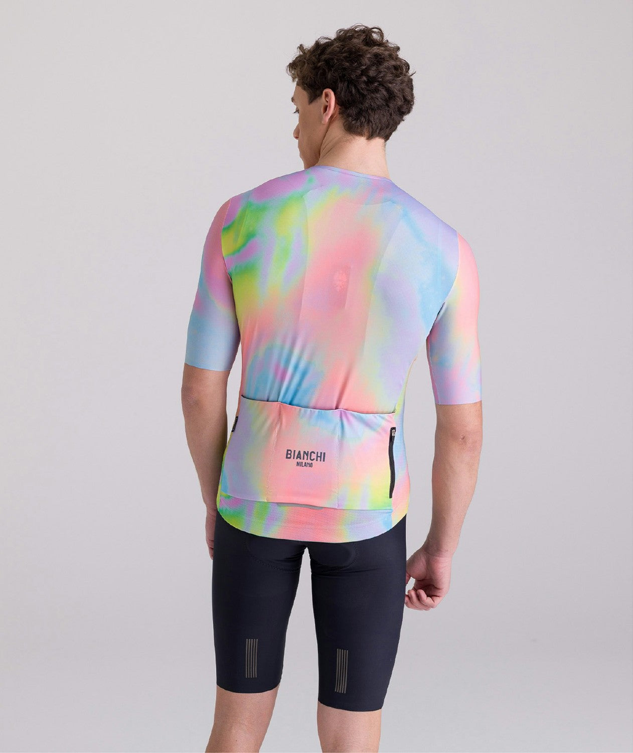 Make every ride stand out with the Pop Cycling Jersey from the Bianchi Milano collection — a perfect mix of versatility, performance, and bold style. With its vibrant psychedelic print, slim fit, and raw-cut sleeves, this jersey delivers striking looks and unrestricted movement. Crafted from Polartec® Power Stretch fabric, it offers excellent elasticity, support, and breathability. Practical features include a triple rear pocket, an extra zip pocket for secure storage, and reflective elements for enhanced visibility. A low collar and covered zip add to the comfort, making it ideal for riders who want technical performance with a touch of personality.