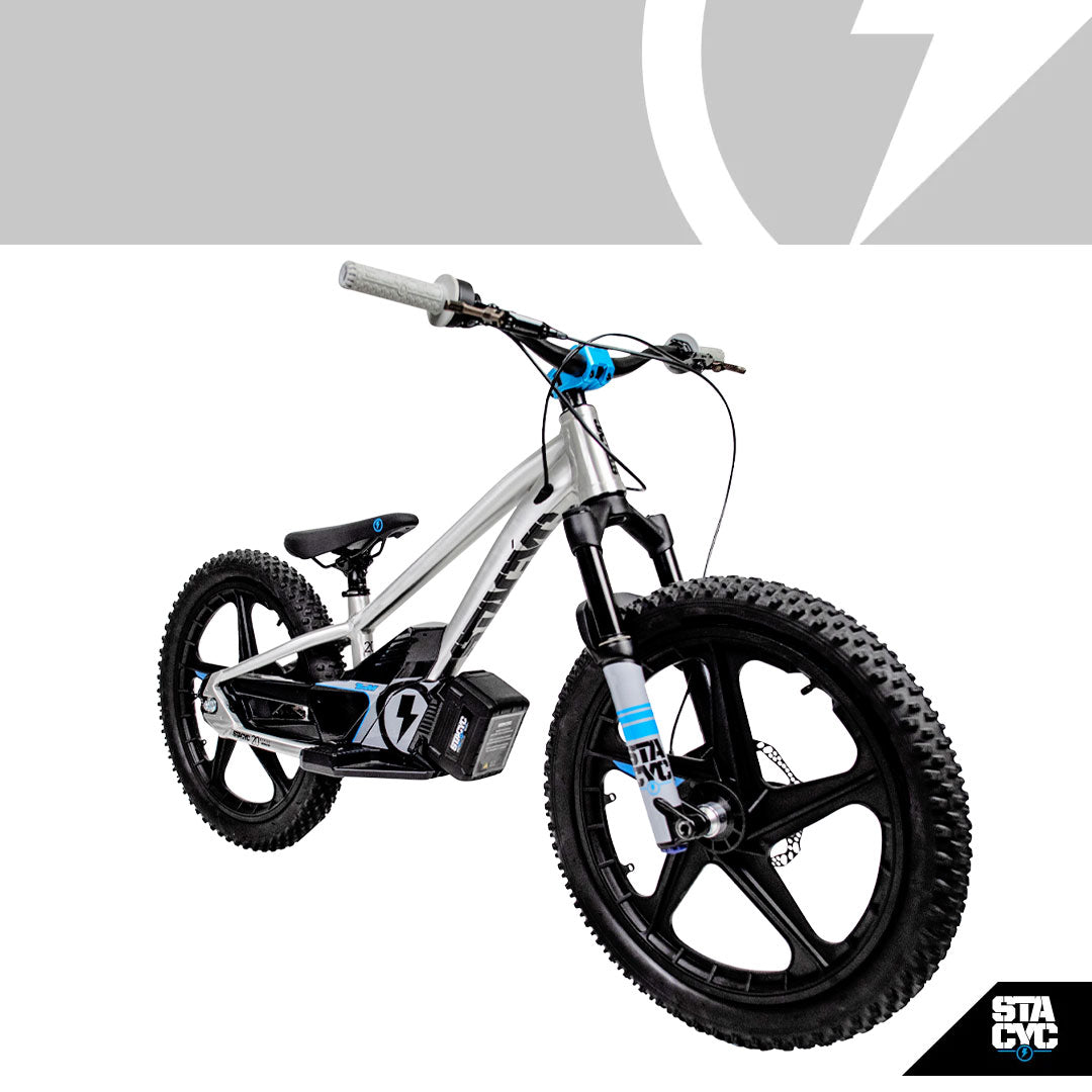 The TEAM Edition arrives fully equipped with a distinct brushed aluminum frame, cyan anodized stem, Hayes Dominion A2 brakes, Manitou JUNIT forks, gray STACYC grips and exclusive TEAM Edition graphics. All the bells and whistles to elevate your growing ripper’s style and performance!