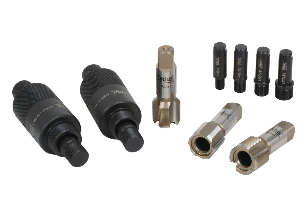 This tool set boasts an impressive working stroke of over 20 mm, ensuring its versatility. Whether confronting pressed-on cranks or the latest screw-connected stop crank seats, both systems can be efficiently, securely, and professionally removed. Additionally, the set includes an M22x1 tap for re-cutting existing crank threads and an M24 core hole cutter with an M24x1 recutter, enabling the creation of new, larger threads in the crank. Elevate your toolkit to ensure a seamless experience in handling a variety of crank configurations.