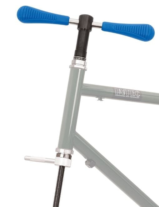 This press tool simultaneously presses top and bottom headset cups into the head tube.