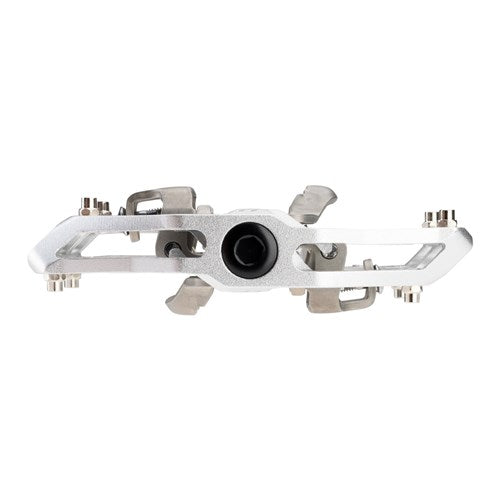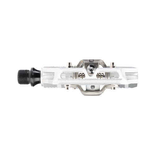 A Gravity clipless pedal body CNC-machined out of 6061-T6 aluminum. It utilizes an ultra-robust forged and CNC-machined chromoly steel axle. The fully serviceable triple-bearings system consists of a LSL self-lubricating bushing, a needle bearing, and an industrial roller bearing. Quad seals keep the internals remain dry in any conditions. The dual-sided clip-in system is compatible with classic SPD cleats. The retention system has an adjustable spring tension to finetune entry and relase, while offering 5 degrees of free float. The large platform around the clip-in system provides a solid shoe support for optimized control and power transfer.