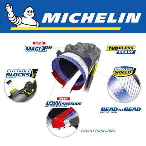 BI-COMPOUND: Magi-X-DH: Rubber compound specifically designed for Downhill for maximum grip in wet and dry conditions whatever the temperatures. Technology that ensures the most grip in the Michelin range.