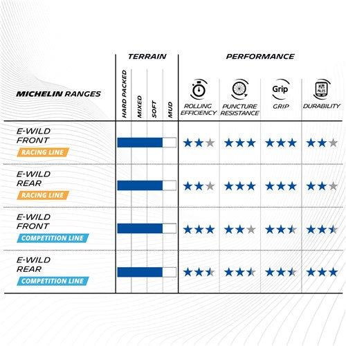 • Maintain Momentum: The MICHELIN E-Wild Rear tread pattern has been developed to maximize traction in climbing.