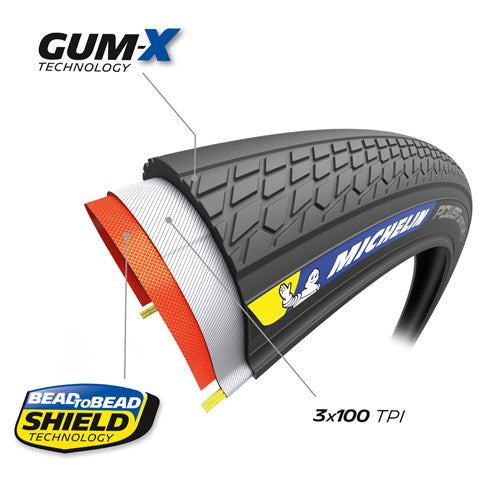 Experience fast rolling speed and an efficient ride thanks to the smooth tread pattern centre line and MICHELIN Gum-X technology