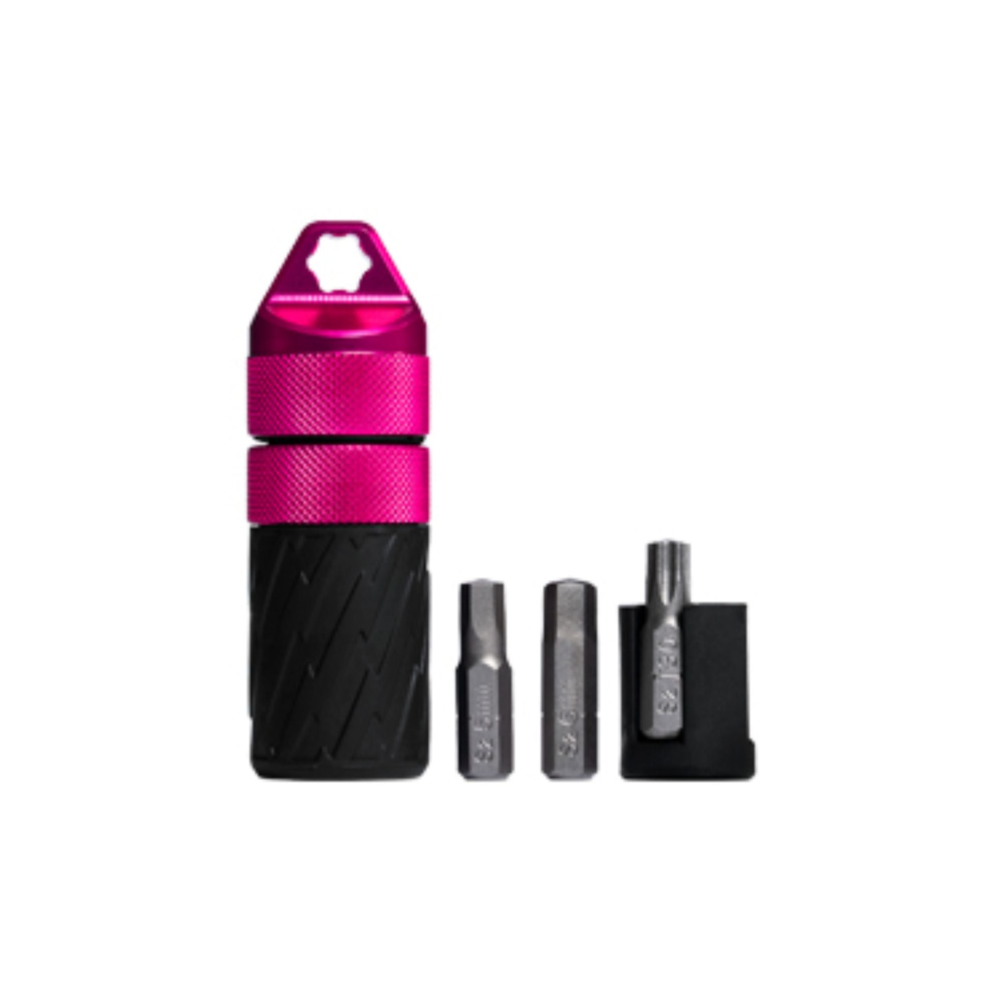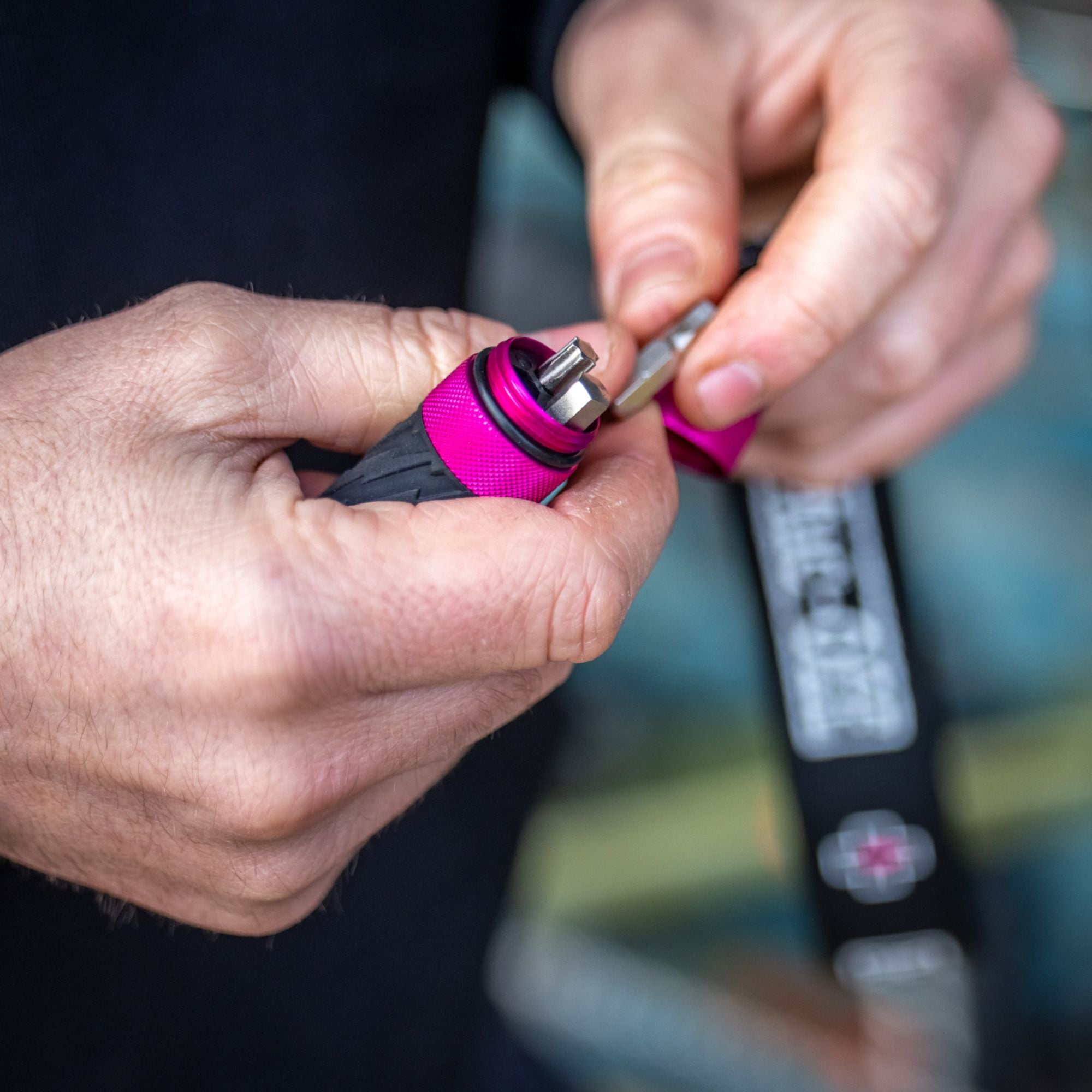 Our new eBike precision machined drivetrain tool contains three different sized tool bits, which snap into place with a magnetized connection, all wrapped up in a durable CNC machined 6061 aluminium body. It fits straight onto your chain ring, so you can spin your crank backwards, and the protective silicone sleeve prevents any crank damage. It comes supplied with a handy lanyard and carabiner clip, so you can keep the tool on hand for when your drivetrain needs some lovin’!
