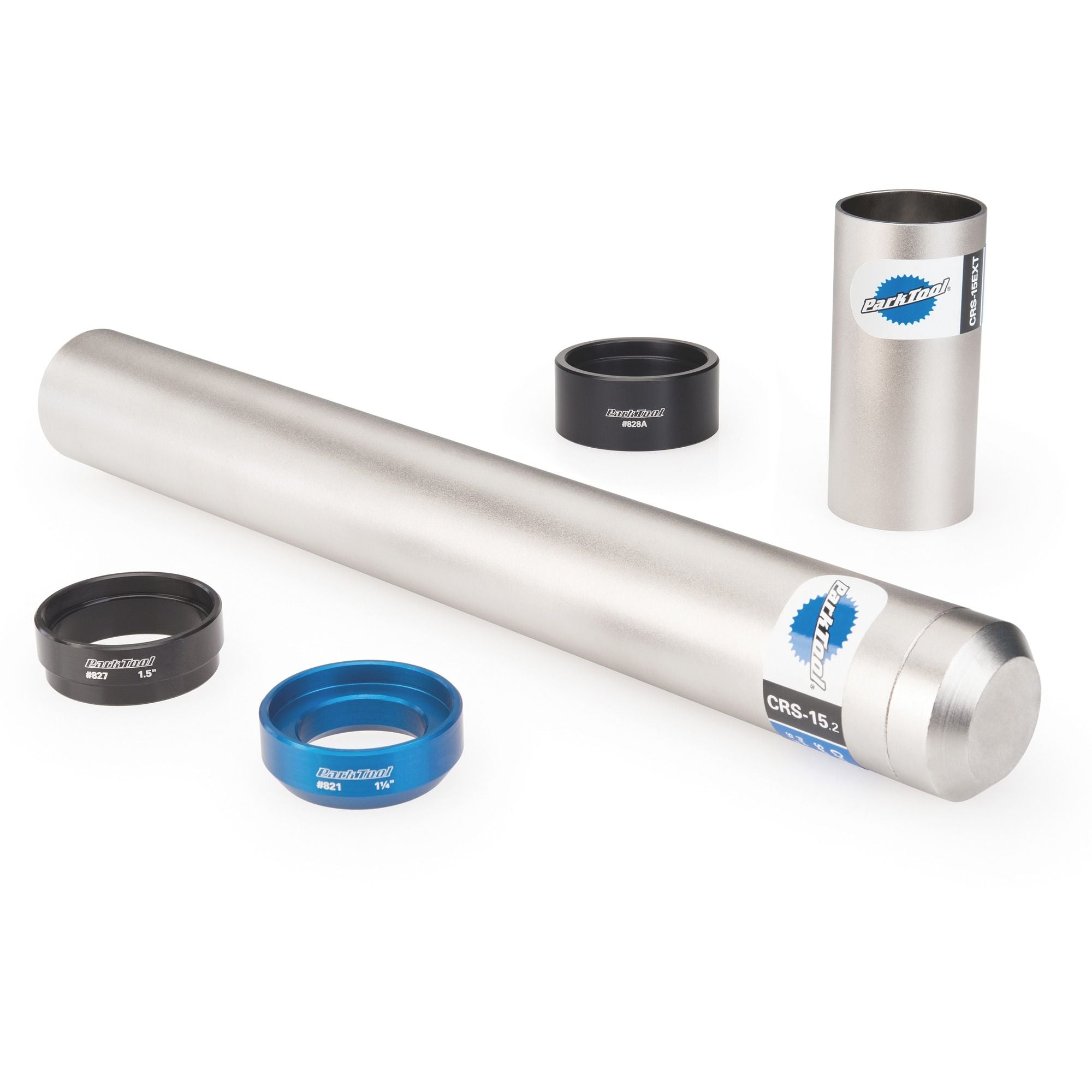 The CRS-15.2 uses two different insert rings to install bearing races on the 1.5" and 1-1/4" forks. The bearing surface is spared a direct hit by using an aluminum inserts. Using a hammer, tap firmly on the end cap of the tube and seat the race into its proper place safely and accurately. Included extension allows work on fork steering tubes up to 425mm.