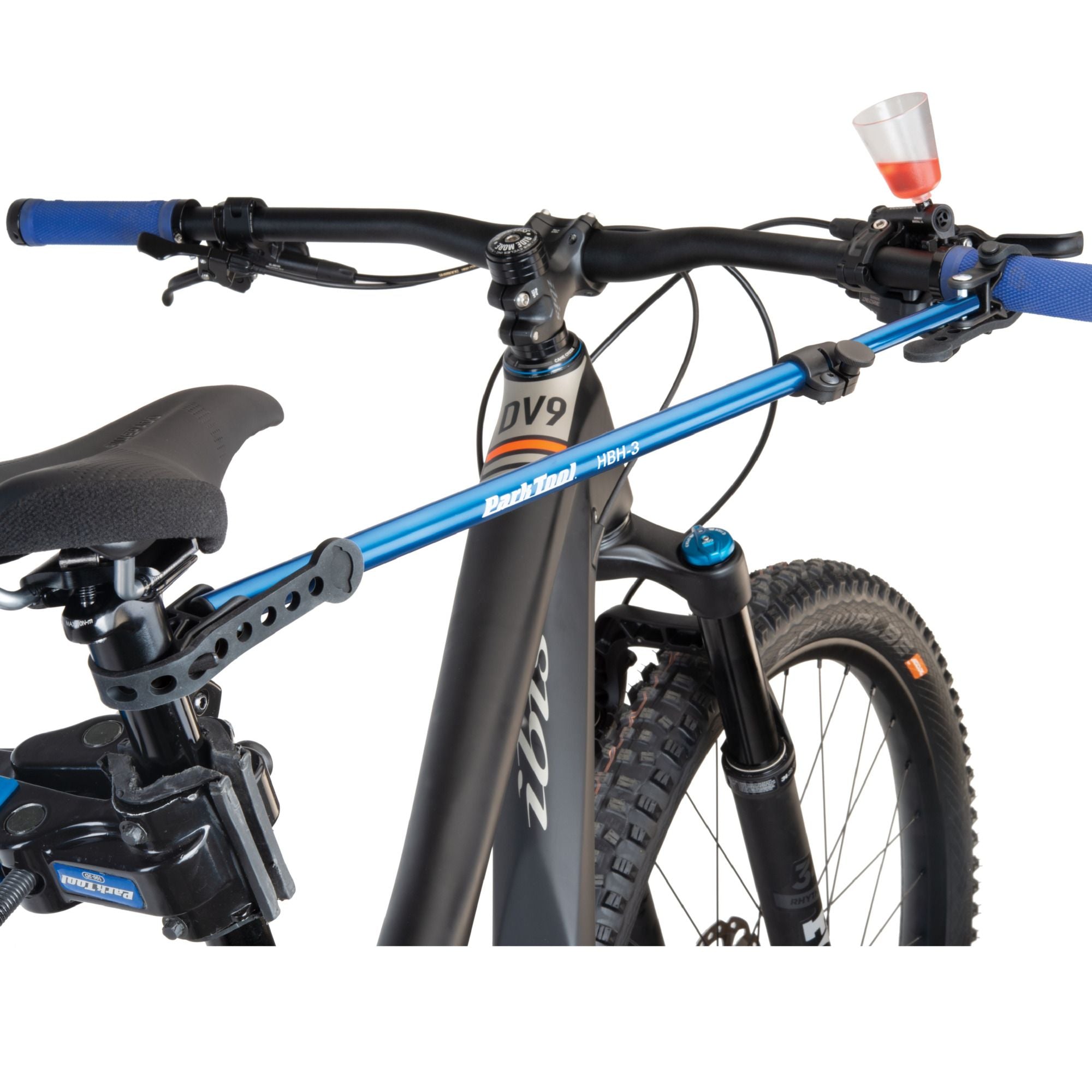 The HBH-3 securely holds handlebars in place on any bike in any position while in a repair stand. Useful for brake bleeding, cable and housing routing, lever adjustment, or any scenario where you want to prevent the handlebars from rotating, including storage or working with the bike rotated upwards. With its articulating clamps and adjustable straps, the HBH-3 can easily be attached in a wide variety of positions onto almost any handlebar, seatpost, frame, fork, or repair stand. Anodized aluminum construction with soft rubber straps.