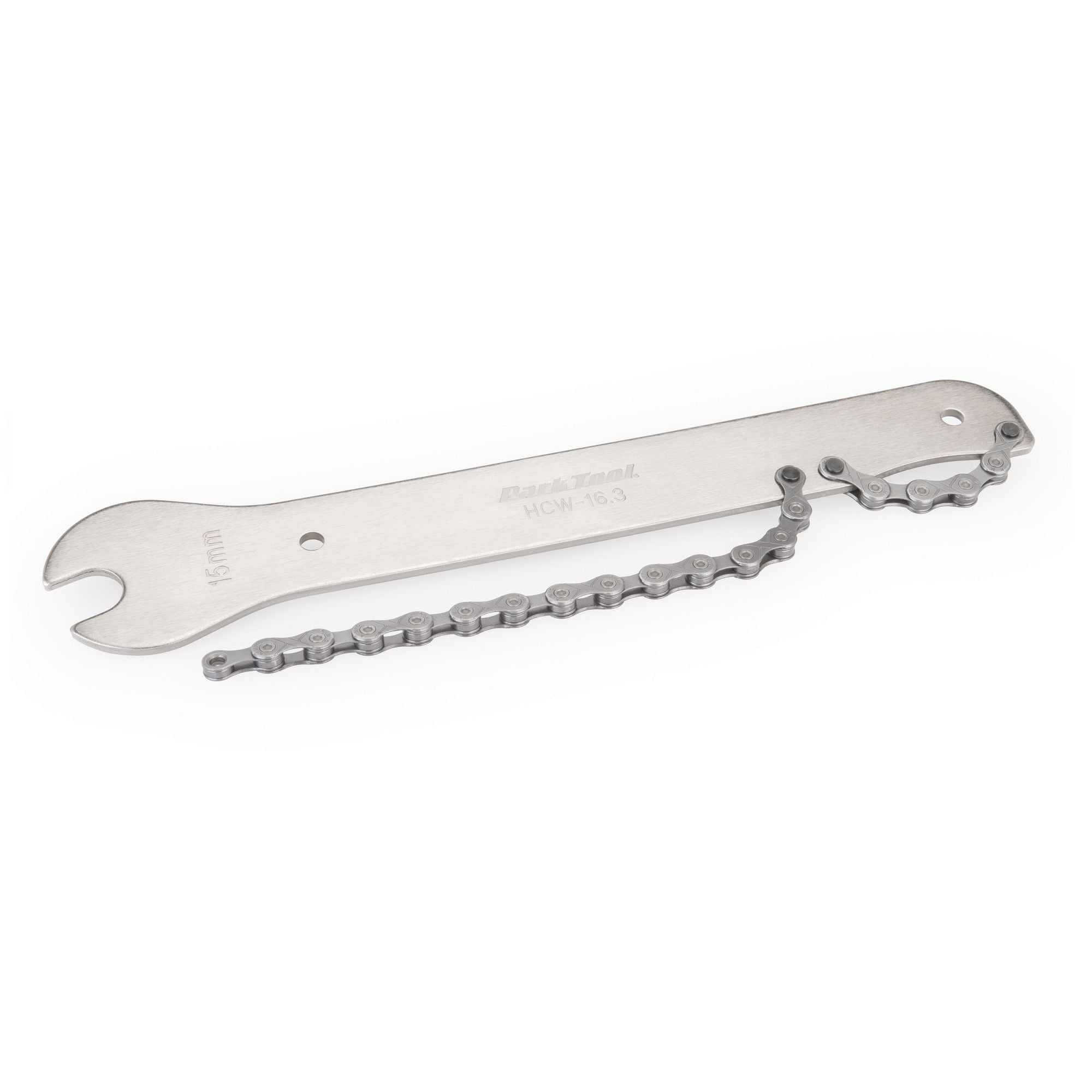 The HCW-16.3 is a combination 15mm pedal wrench and chain whip. Use for both pedal removal/installation and for cassette removal. Chain whip features improved compatibility with 5-speed to 12-speed mountain and road bike cassettes and freewheels. The HCW-16.3 is 10.75" long (27.3cm).