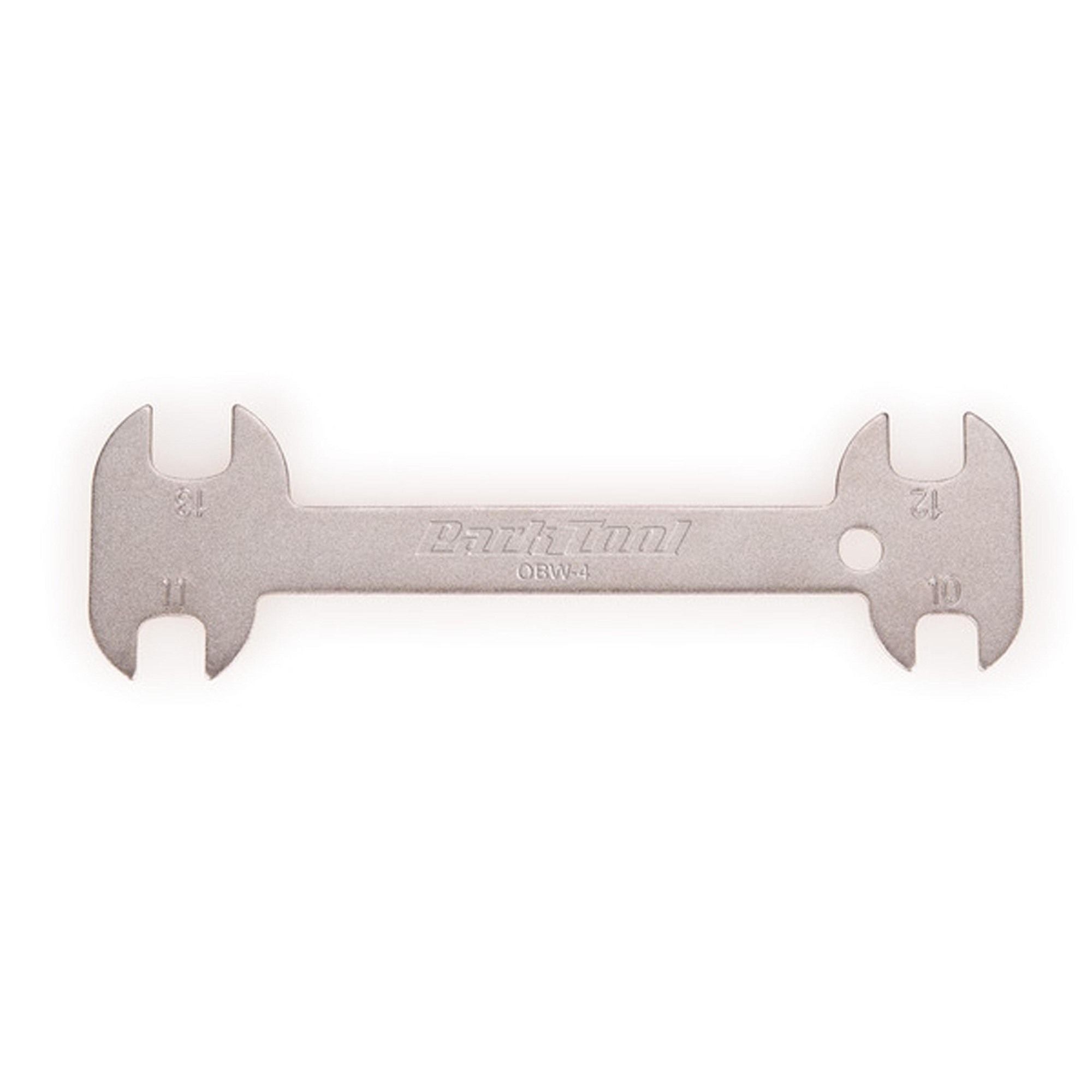 A thin offset wrench with 10, 11, 12, and 13mm openings made to fit and adjust many models of side pull and dual pivot brakes.