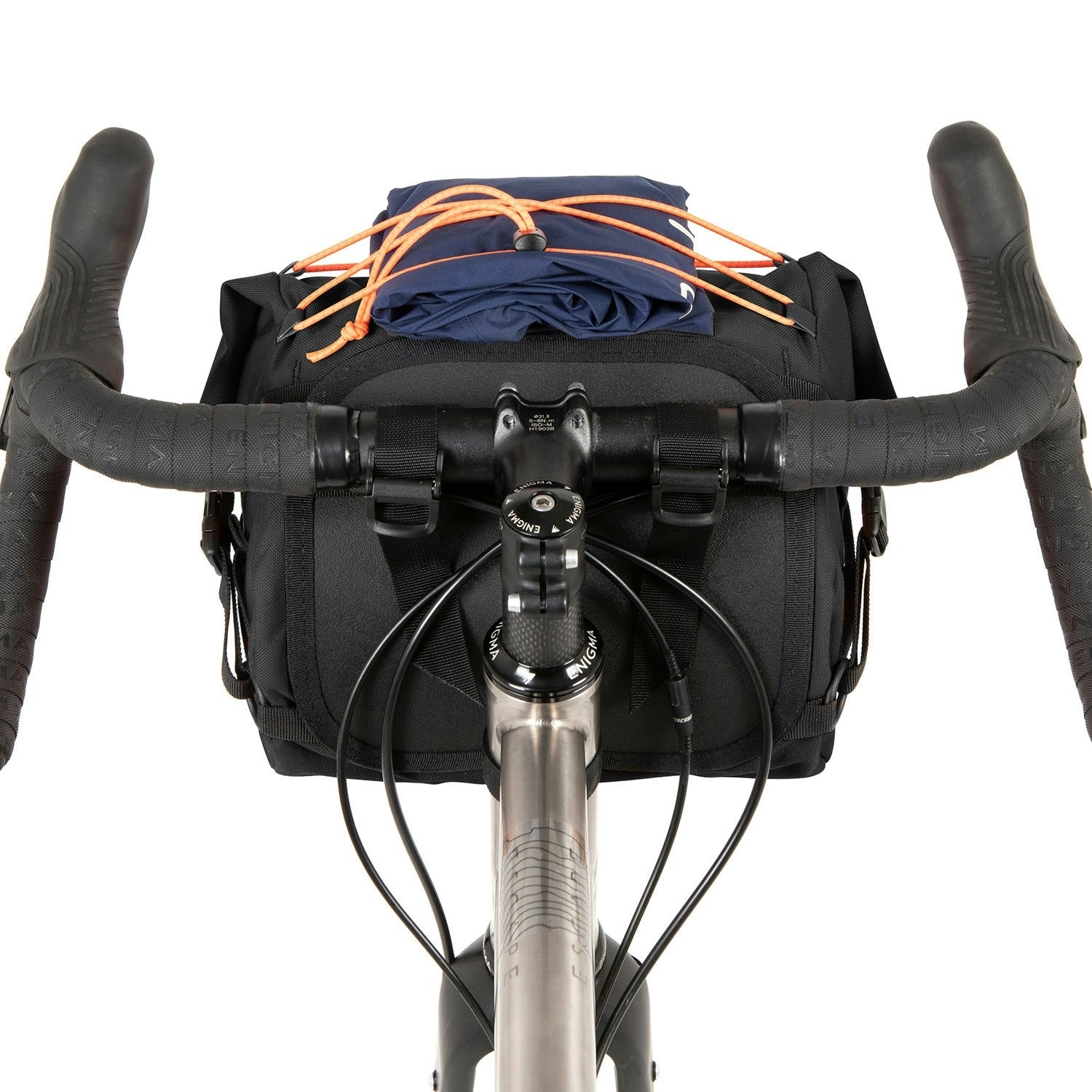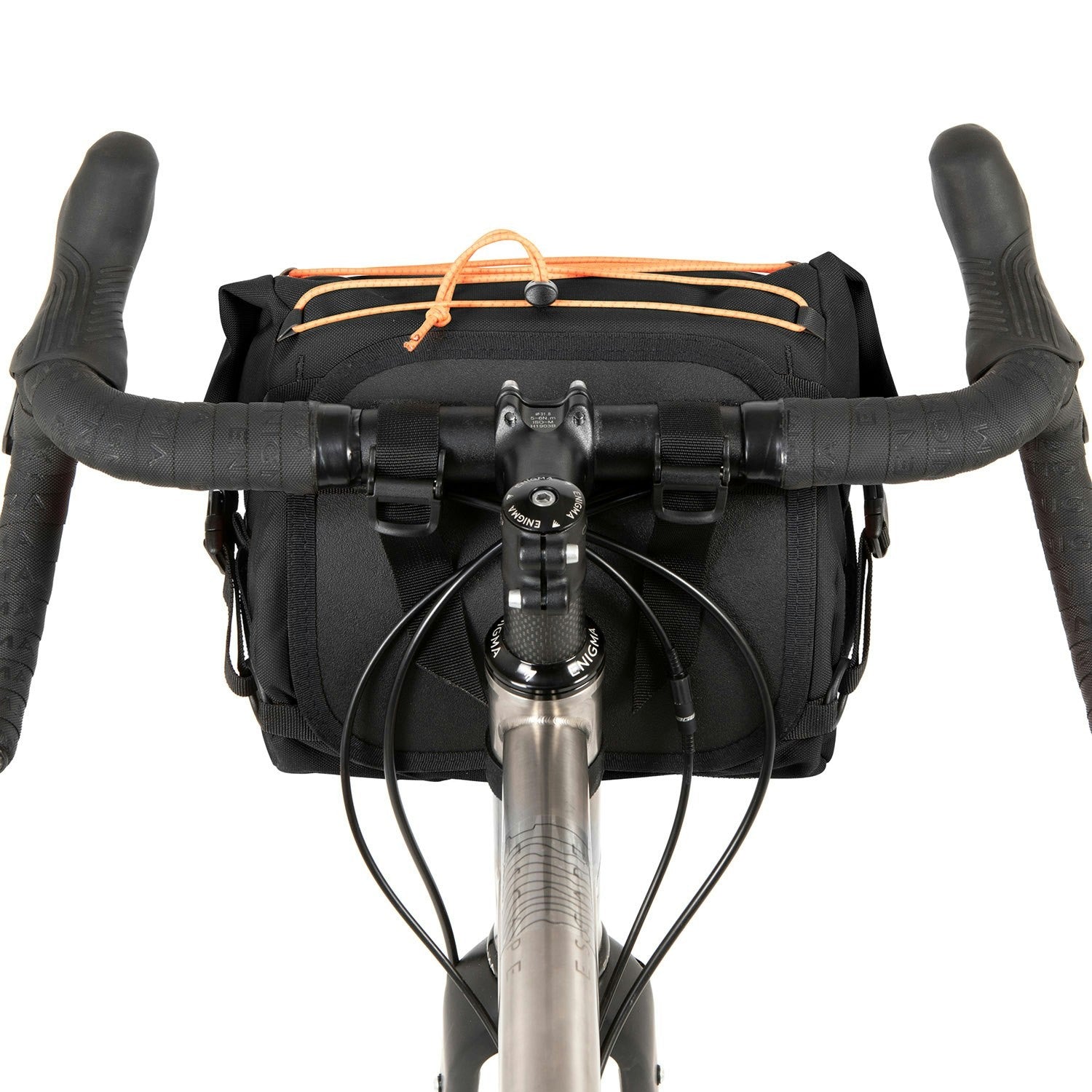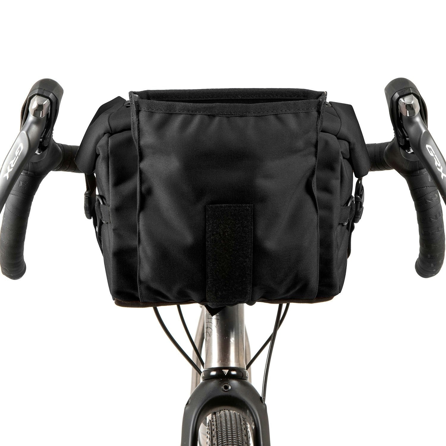 The Bar Pack is ideal for shop errands, off-road exploration, or long-distance audaxes, providing 10 liters of storage with its dual waterproof roll-top compartments. The hypalon front closure doubles as a light mount or extra strapping point, while a mini D-lock holster offers additional versatility for urban use. Structural support comes from an internal stiffener and hard shell back, with a side-release buckle system keeping the pack compact. Its MOLLE adjustable headtube retention system and foam spacers with spring-loaded cam locks ensure a secure handlebar fit. Elastic drawcords provide easy access storage for items like jackets or gloves. Handmade in Yorkshire from waterproof textured nylon, it’s completed with a vegan-friendly PU Restrap label.