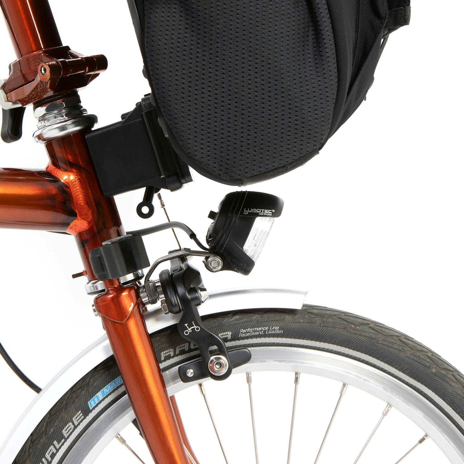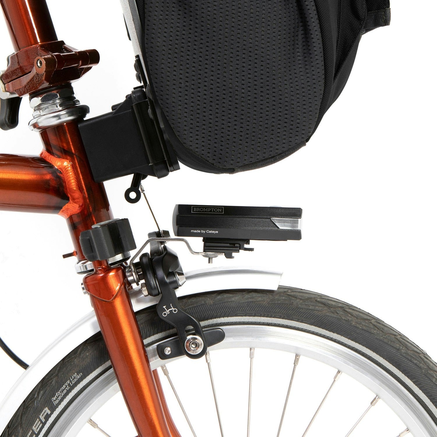 It mounts easily to Brompton front carrier blocks, with built-in stiffeners to retain shape under load. Constructed from waterproof textured nylon with a tape-sealed lining, the City Loader protects your belongings from rain. Compatible with Brompton front lights, dyno lights, and reflectors.