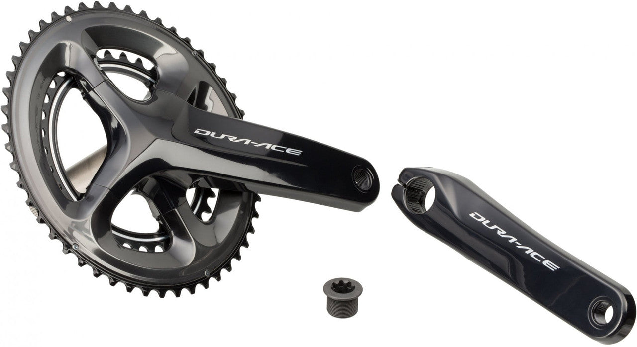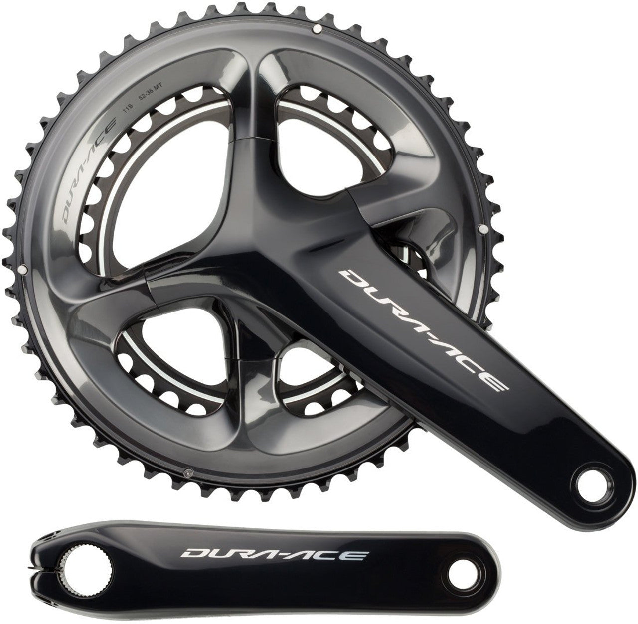 This Shimano Dura Ace FC-R9100 HOLLOWTECH II Crankset (2x11-speed) is wider than its predecessor but is still very lightweight by utilising the Hollowtech II technology. The highly rigid hollow structure cuts down on weight but still maintains strength resulting in better power transfer and more precise front shifting.. Series: DURA-ACE