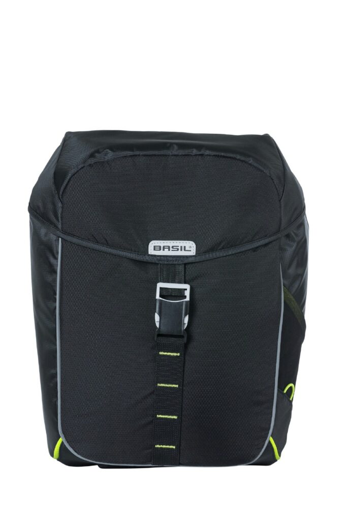 - The Basil Miles Double Bag is a double-sized bike bag with a total capacity of 34 litres.