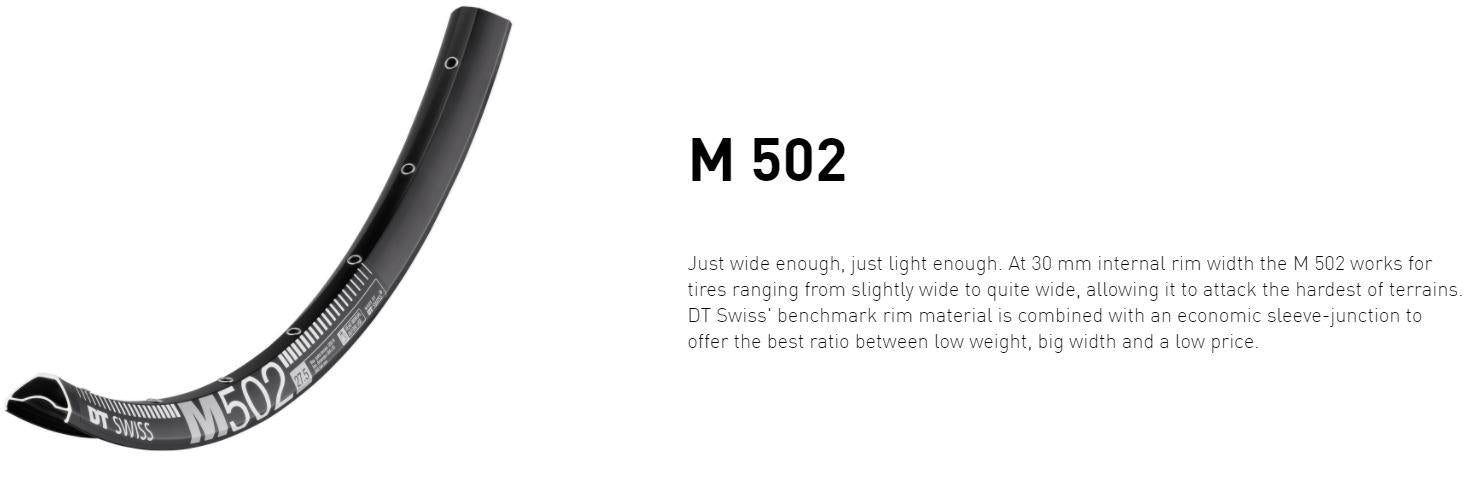 Just wide enough, just light enough. At 30 mm internal rim width the M 502 works for tires ranging from slightly wide to quite wide, allowing it to attack the hardest of terrains. DT Swiss' benchmark rim material is combined with an economic sleeve-junction to offer the best ratio between low weight, big width and a low price.