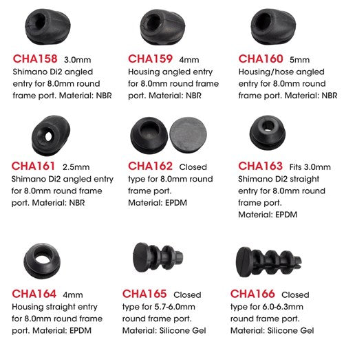 • CHA163 Fits 3.0mm Shimano Di2 straight entry for 8.0mm round frame port. Material: EPDM