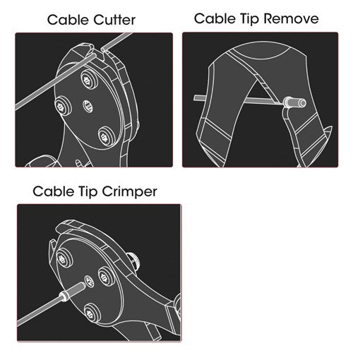 Features hardened SK5 steel cutting blades formed specifically for inner cables. The unique integrated crimper uses three blades that contract as the handle is closed, giving a professional and secure 3-sided crimp. The ergonomic handles ensure comfort for all-day use. Cutout in arm can be used to remove previously-installed cable tip.