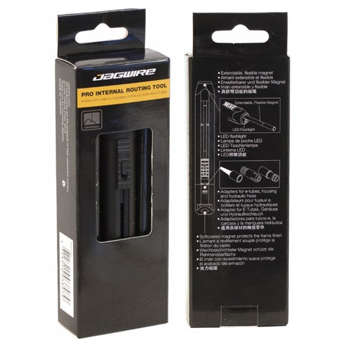 Jagwire's Pro Internal Routing Tool simplifies routing through a frame, using powerful magnets to safely and easily guide cables, hydraulic hoses and e-shift wires. Constructed from reinforced plastic. LED Flashlight (batteries included). Extendable, flexible, magnet. Soft coated magnet protects the frame finish. Easy to follow detailed instrunction sheet. Retractable, flexible magnet can be inserted into receiving end of a housing run to find the magnetic adapter and easily pull it through. Magnetic adaptor attaches to cables, housing, hydraulic hose, and electronic wires.