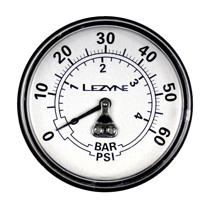 60 PSI replacement analog pressure gauge for all Dirt Drive and OverDrive floor pumps, includes glue and O-ring. Updated internals offer even more precision at lower pressures.