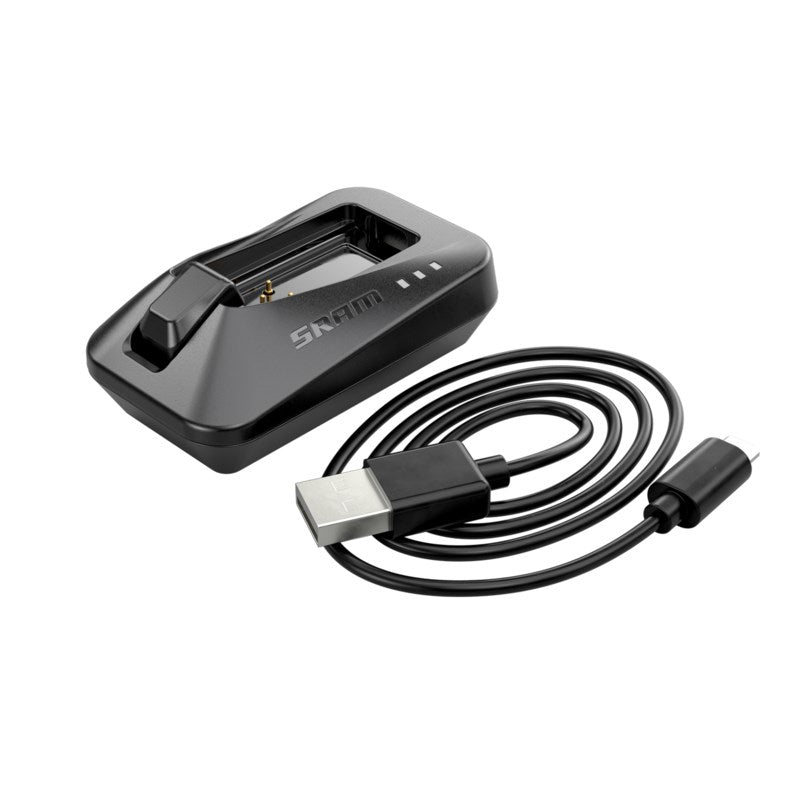 SRAM ETAP/AXS BATTERY CHARGER AND CORDSRAM batteries are literally a snap to remove and charge. Just flip the tool-free battery latch up and slide the battery up and out of the derailleur. Then snap the battery into the USB powered charger and connect the charger to any USB power source or A/C USB adaptor. A full charge takes up to 60 minutes to complete.