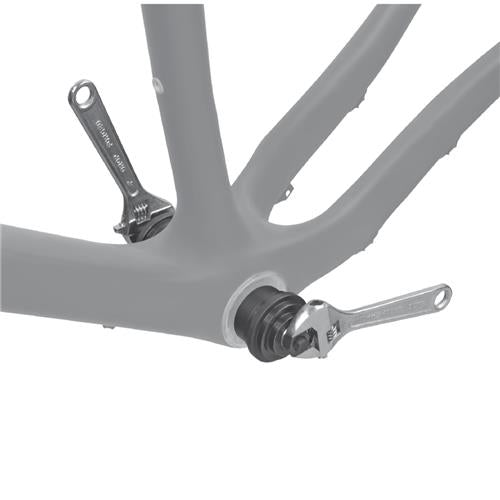 Precision bearing press for installing pressfit bottom bracket bearings and cups. Compatible with BB30 and BB86 bottom bracket systems. Made from hardened steel for longevity and durability. Used with a open wrench.