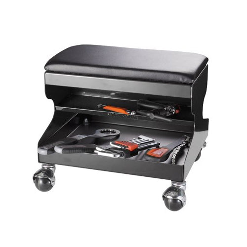 Designed with soft cushion to help mechanics work efficiently and to move around freely. Two convenient storage spaces for necessary tools and parts. Features ball wheel design for moving around work places easier. Height: 310mm. Tools are not included.