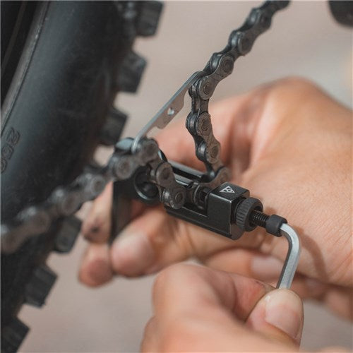 An aluminum alloy ultra-lightweight portable chain breaker that supports 13s and Campagnolo® hollow pin chains and increased convenience in storage due to its compact size after folding. Includes storage space for a chain hook and chain pin.