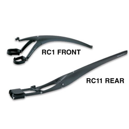 For 700C Wheel The DeFender RC1 / RC11 road fender set complements any road race bike. The RC1 front fender has a unique quick release bolt clip and the RC11 rear fender has a simple and secure mount that removes in seconds. The DuaLink angle adjustment allows for optimized fender position providing maximum protection from road spray and grime. The DeFender RC1 / RC11 set is made of high impact plastic weighing only 39 g / 117 g and the highly polished underside prevents dirt buildup. Fits road tires up to 700 x 25c.