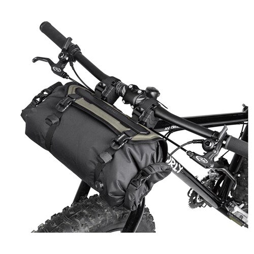 Pack all the gear you need and enjoy the freedom of bikepacking. FrontLoader is perfect for carrying light yet bulky items like sleeping bags, camping gear and spare clothing. Featuring a tough outer support harness and constructed of durable abrasion and water resistant materials, it’s easily installed or removed with two straps, special spacer mounts and quick release buckles. A backside head tube strap attachment increases load stability. An 12 liter removable waterproof drybag keeps contents completely protected from wet weather and splashes while a built-in air release button purges unwanted air from the bag to effectively compress its contents.