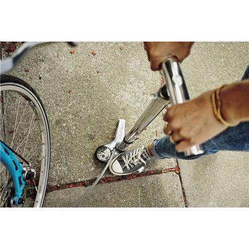 X.O. stands for extraordinary – the only way to describe this CNC machined alloy JoeBlow® floor pump. An elegant yet modern representation of the classic floor pump, the JoeBlow® X.O.’s construction – from its wide stable base to its smoothly shaped handle – is precisely machined and beautifully polished aluminum alloy. Its smooth action and long stroke powers up to 200 psi / 14 bar to fill even the highest pressure track tires. To make tire inflation simple we’ve added our SmartHead® ThreadLock hose head which fits Presta and Schrader valves. The machined aluminum base adds maximum stability and an extra-long braided metal hose easily reaches bikes mounted in the workstand. Note : ThreadLock pump head should be used with caution on do removable valve core type Presta inner tubes and tubular tires as the valve core may be inadvertently removed when unthreading the pump head. To reduce the possibility of accidental removal of the valve core, ensure ThreadLock is installed and removed correctly and in line with the valve stem