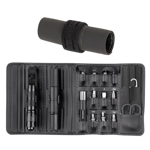 A compact roll-up, multi-function ratchet tool set with tubeless tire repair / CO2 inflation kit and chain tool has everything you need to fix and make precise adjustments to your bike while on the road.  Features a fine tooth ratchet mechanism with reverse lever and thumb wheel for quick rotation and control in tight spots and includes Speed Sleeve bit holder, hardened steel tools in 2, 2.5, 3, 4, 5, 6mm hex, T10, T15, T25 Torx®, #2 Phillips bits, Aluminum CO2 inflator, Stainless steel 3.5mm Plug Insertion Tool, tire repair plugs, chain tool, and chain hook.  The ultrasonic welded roll-up pack keeps things organized and secure, and even has a pocket to store two silicone straps for carrying one 16g CO2 cartridge and two tire levers.