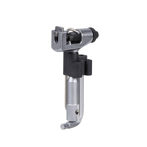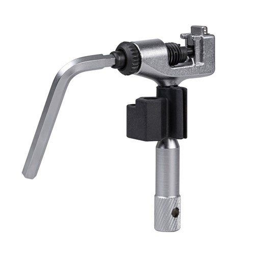 High quality, long service life, cast CrMo steel construction chain tool for single and multi-speed chains up to 13 speed, including Campagnolo® hollow pin chains. Built-in clip holds tool pieces together. Contains 4 and 5mm hex wrenches and chain hook