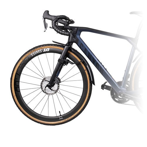 The perfect quick-mount, dual color front fender that attaches to gravel bike forks with hook and loop straps easily and securely. Adjustable struts provide a closer fit to the tire and excellent mud / spray protection while the highly polished underside helps prevent dirt buildup and aids in cleaning. Included 3M reflective decals provide safety at night.
